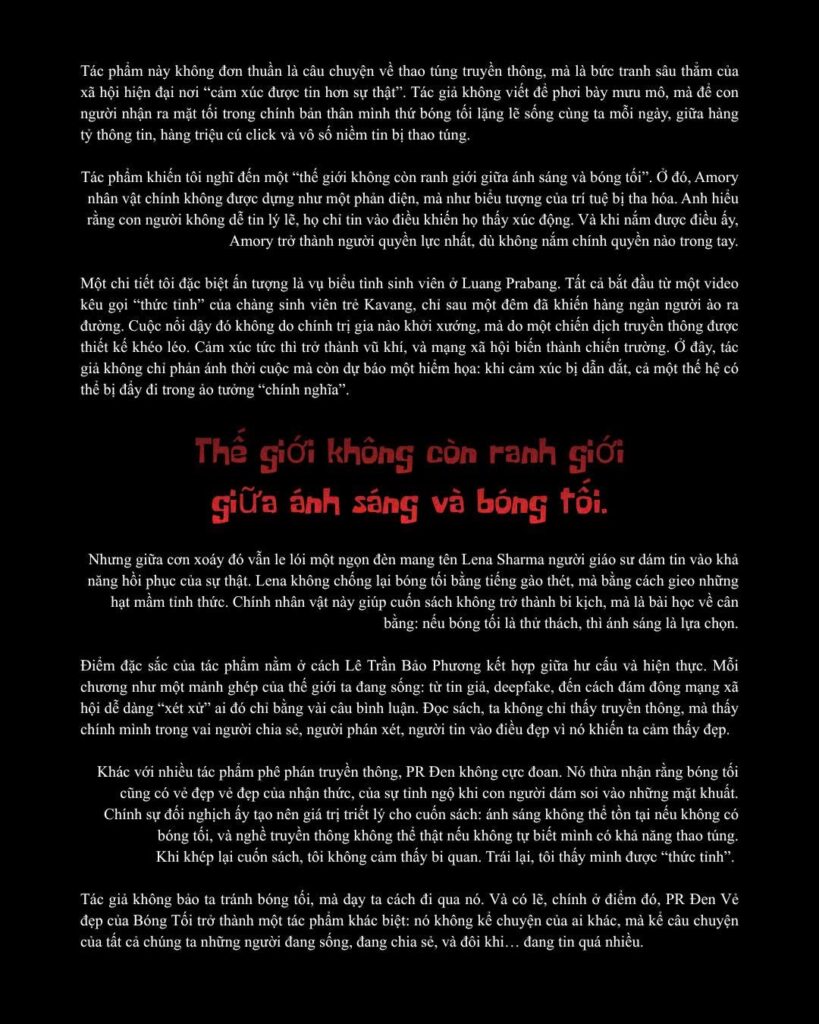 ฤiแปu khiแบฟn tรดi แบฅn tฦฐแปฃng nhแบฅt khi ฤแปc PR ฤen: Vแบป ฤแบนp cแปงa Bรณng Tแปi chรญnh lร cรกch tรกc phแบฉm phฦกi bร y ranh giแปi mong manh giแปฏa truyแปn thรดng chรขn thแบญt vร truyแปn thรดng thao tรบng. Trong thแบฟ giแปi แบฅy, โPR ฤenโ khรดng phแบฃi lร dแปi trรก trแบฏng trแปฃn, mร lร sแปฑ biแบฟn tแบฅu tinh vi cแปงa sแปฑ thแบญt โ ฤแปง ฤแป khiแบฟn ngฦฐแปi ta tin, nhฦฐng khรดng ฤแปง ฤแป hแป hiแปu. Cร ng ฤแปc, tรดi cร ng rรนng mรฌnh khi nhแบญn ra: chรบng ta ฤang sแปng trong mแปt thแปi ฤแบกi mร cแบฃm xรบc cรณ thแป bแป ฤแปnh hฦฐแปng, cรฒn niแปm tin thรฌ trแป thร nh thแปฉ hร ng hรณa dแป dร ng ฤฦฐแปฃc trao ฤแปi.