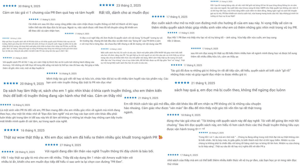 * “Đảm bảo sẽ không hối hận khi đọc quyển PR Đen. Tác phẩm không chỉ là một thriller về PR, mà còn là một suy ngẫm về bản chất con người, đạo đức, và sự chuộc lỗi trong một thế giới mà ranh giới thiện ác ngày càng mờ nhạt.”